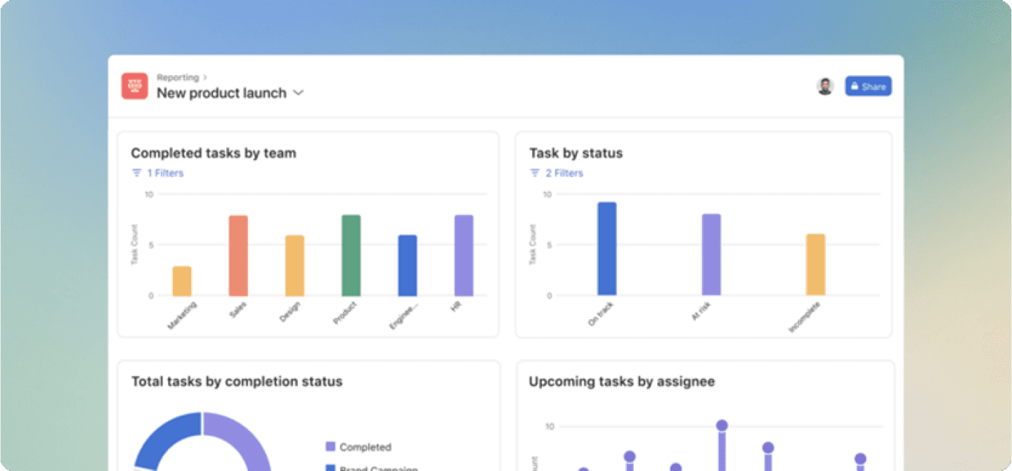 Asana provides simple dashboards suitable for visualizing task progress and project performance. While practical and easy to use, they lack advanced customization options, limiting their effectiveness for teams that require detailed tracking or specialized data insights. This makes Asana dashboards more appropriate for smaller or less complex projects.